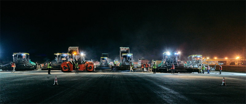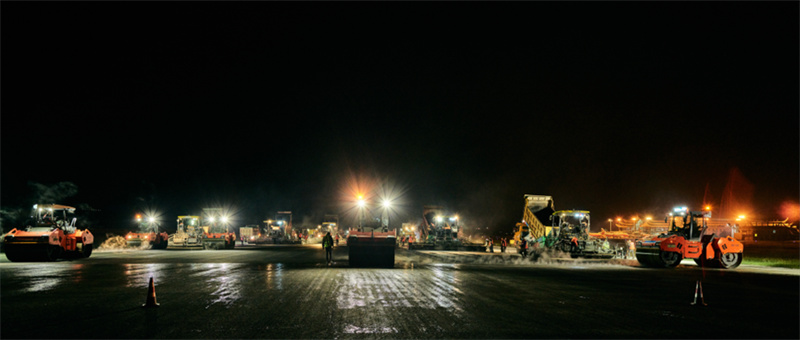 在不足 5 小時的施工窗口期內,8 臺維特根銑刨機次第排開,將舊瀝青道面銑刨移除;6 臺福格勒攤鋪機覆蓋跑道全幅寬度,多臺壓路機緊隨其后往復碾壓。