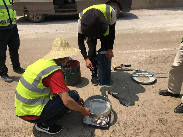 冷再生層壓實(shí)后采用灌砂法進(jìn)行壓實(shí)度檢測(cè),并檢查冷再生層的厚度。